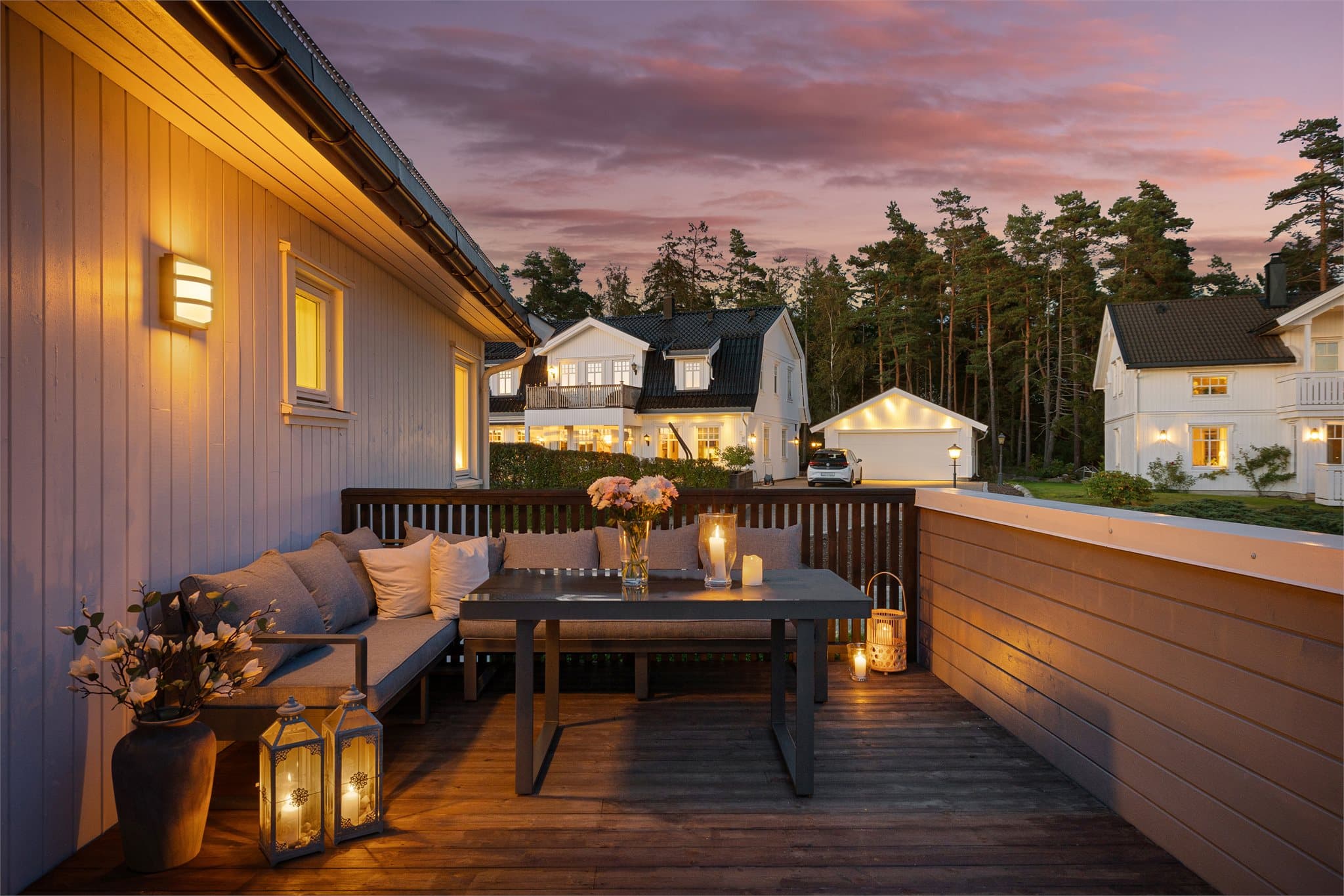 Bygget fremstår velholdt og ble malt utvendig i 2023 etter sameiets felles vedlikehold. Fasaden er kledd med stående trekledning som gir et tidløst og klassisk uttrykk. Takkonstruksjonen er utført med takstoler i tre og saltaksform, tekket med plater e.l., noe som gir en robust og tradisjonell byggestil. Til leiligheten følger en egen carport som gir parkering under tak. Her er det også montert elbillader, som gjør det enkelt og praktisk å lade elbil i hverdagen. Entré Leiligheten ligger i byggets 2. og øverste etasje og nås via trapp opp til en privat og solrik terrasse. Et praktisk glasstak over inngangsdøren gir ly for vær og vind. Fra terrassen kommer du inn i en lys og innbydende entré med praktiske fliser på gulv. Her er det plass til sko og oppbevaring. Stue og kjøkken Stuen er leilighetens naturlige samlingspunkt. De store vindusflatene gir rikelig med dagslys og en åpen og luftig romfølelse. Midt i rommet finner du en vedovn som gir både varme og koselig stemning på kjølige dager. Stuen har god plass til både sofagruppe og spiseplass, og herfra er det utgang til en romslig balkong. I 2023 ble det lagt nytt laminatgulv (BerryAlloc) som gir et moderne og stilrent preg. Gulvet har varmefolie som sørger for lun komfort. Kjøkkenet ligger i åpen løsning mot stuen og er innredet med lyse, glatte fronter, laminat benkeplate og nedfelt vaskekum. Integrerte hvitevarer inkluderer platetopp, stekeovn, komfyrvakt og oppvaskmaskin. Det er god skapplass og belysning over benkeplaten. Varmtvannstanken på ca. 120 liter er plassert i innredningen. Bad/vaskerom Badet er lyst og innbydende med fliser på både vegger og gulv. Det er elektrisk gulvvarme. Rommet er innredet med vegghengt toalett, dusjkabinett, servant med innredning og opplegg for vaskemaskin. Et vindu gir godt dagslys og mulighet for naturlig ventilasjon. Soverom Leiligheten har to soverom. Hovedsoverommet har plass til dobbeltseng og ønsket garderobeløsning. Rommet fremstår lunt og stilrent. Det minste soverom passer perfekt som barnerom, gjesterom eller hjemmekontor. Store vinduer gir godt lysinnslipp. Bod Fra gangen er det adkomst til en praktisk innvendig bod/teknisk rom som gir god plass til lagring. Leiligheten har ytterligere en bod på ca. 6 kvm. Balkong og terrasse Leiligheten har to flotte og solrike uteplasser som gir ekstra gode bokvaliteter. Ved inngangspartiet ligger en stor terrasse, perfekt for morgenkaffen. Her er det god plass til utemøbler og beplantning. Fra stuen er det utgang til en romslig balkong, noe som vil være en naturlig forlengelse av oppholdsrommet under sommermånedene. Balkongen har god møbelfrihet og rommer fint både sittegruppe og spiseplass.