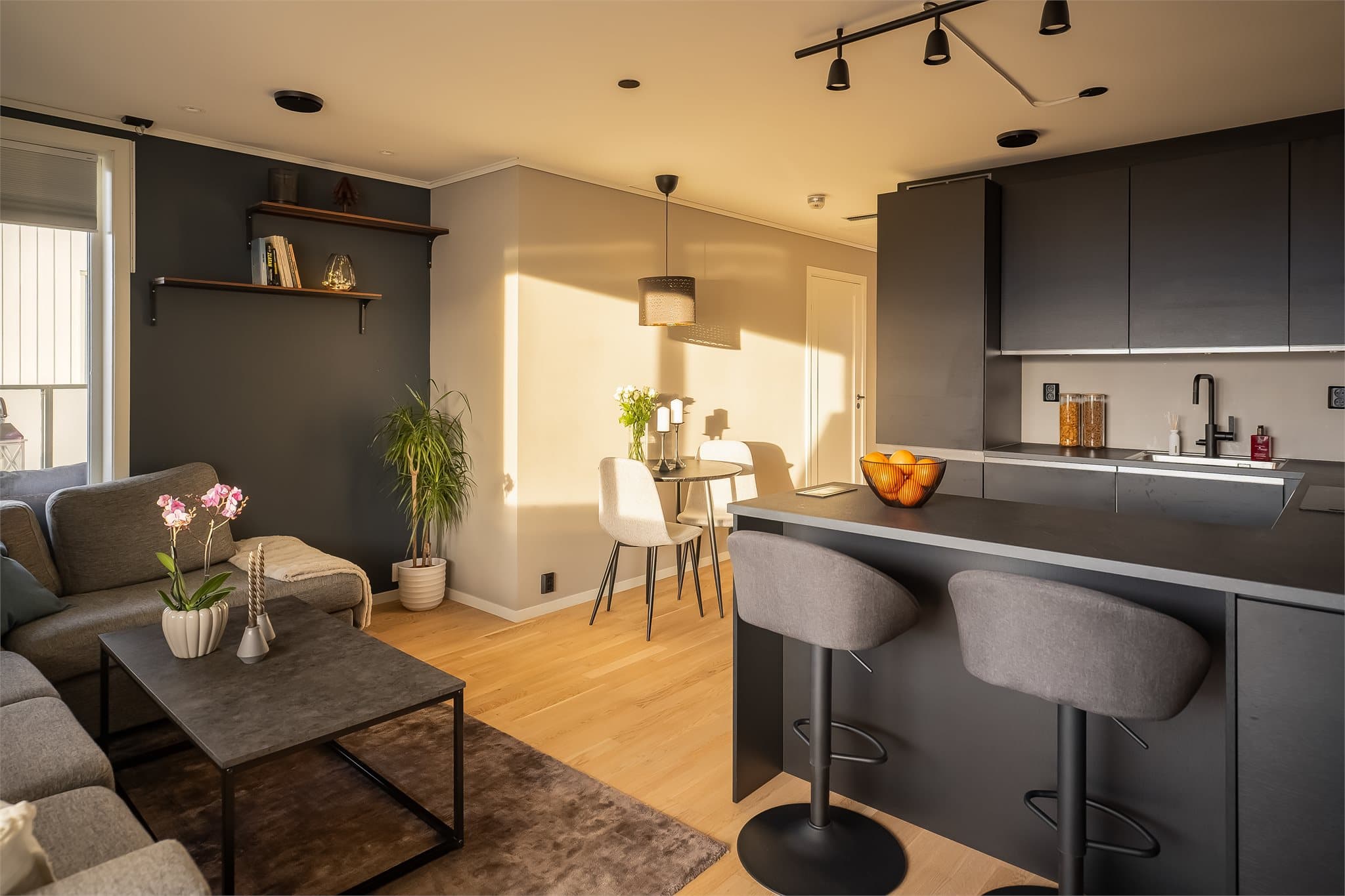Velkommen hjem! Bak inngangsdøren møtes du av en innbydende entré med gode plasseringsmuligheter for oppbevaringsmøbler. Stuen er lys og delikat med store vindusflater som gir godt med naturlig lys. Rommet har en god planløsning med plass til både sofagruppe og et mindre spisebord. Lyse overflater og gjennomgående parkettgulv gir et moderne og behagelig uttrykk. Fra stuen er det utgang til en herlig, sørvendt balkong på 20 kvm med gode solforhold. Det er god plass til utemøbler, så balkongen blir en naturlig samlingsplass i sommerhalvåret. Kjøkkenet er lekkert med en moderne innredning med kjøkkenhalvøy. Kjøkkenet har integrerte hvitevarer og er godt utstyrt med skap- og benkeplass. Leilighetens baderom er flislagt og har downlights i himlingen. Det er varmekabler i gulv og man har dusjhjørne med innfellbare dusjdører i glass. Det er gode oppbevaringsmuligheter, samt opplegg for vaskemaskin. Et stort speil med integrert belysning gir rommet et moderne uttrykk. De to soverommene er lune og delikate med plass til både seng og tilhørende møblement. Hovedsoverommet har skyvedørsgraderobe som sørger for gode oppbevaringsmuligheter. Rommene er holdt i moderne og behagelige fargetoner som gjør det enkelt å sette sitt eget preg gjennom pynt og interiør. Leiligheten oppvarmes med fjernvarme og har balansert ventilasjon som bidrar til et godt og behagelig inneklima. Boligen disponerer fast parkeringsplass med elbillader i oppvarmet parkeringskjeller. Leiligheten holder gjennomgående høy standard, med tilstandsgrad TG1 eller TG0 på alle punkt.